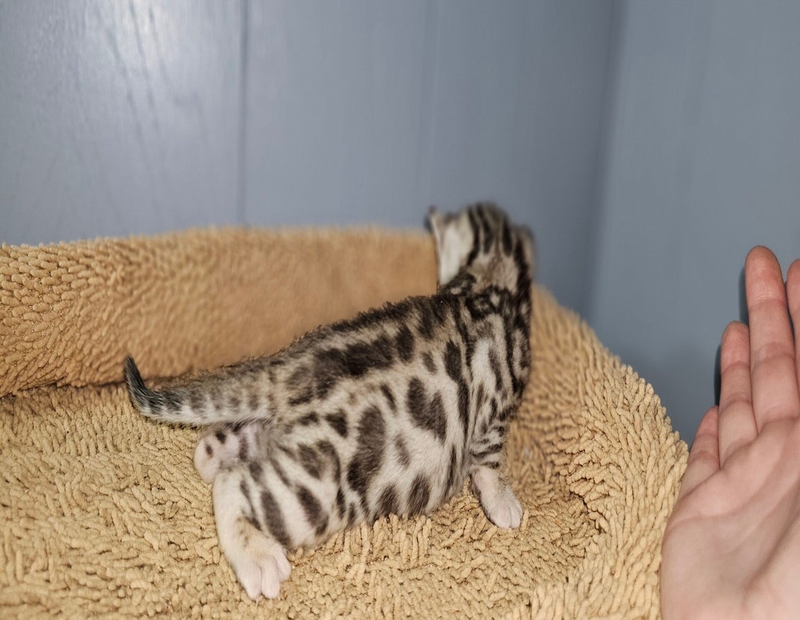 UPCOMING LITTER: We’re excited to announce that we are currently preparing for our next litter from Aurora and Onyx! This pairing is expected to produce stunning silver kittens with minimal tique, breed-standard ears, and striking, dark contrasting rosettes. Stay tuned for updates on this exceptional litter!
